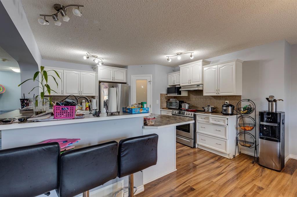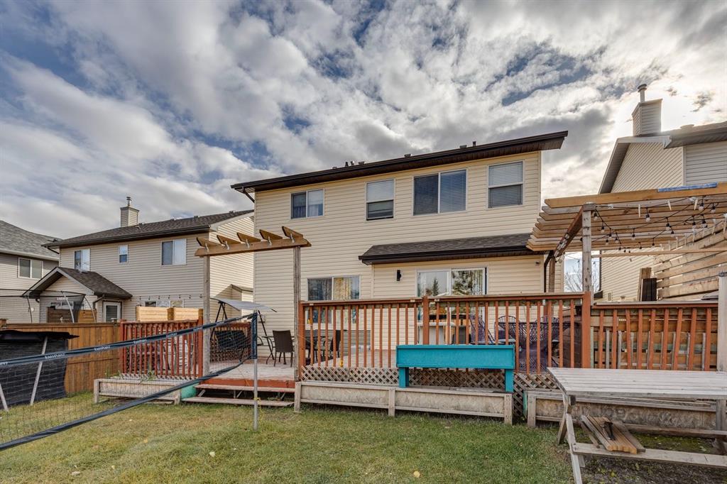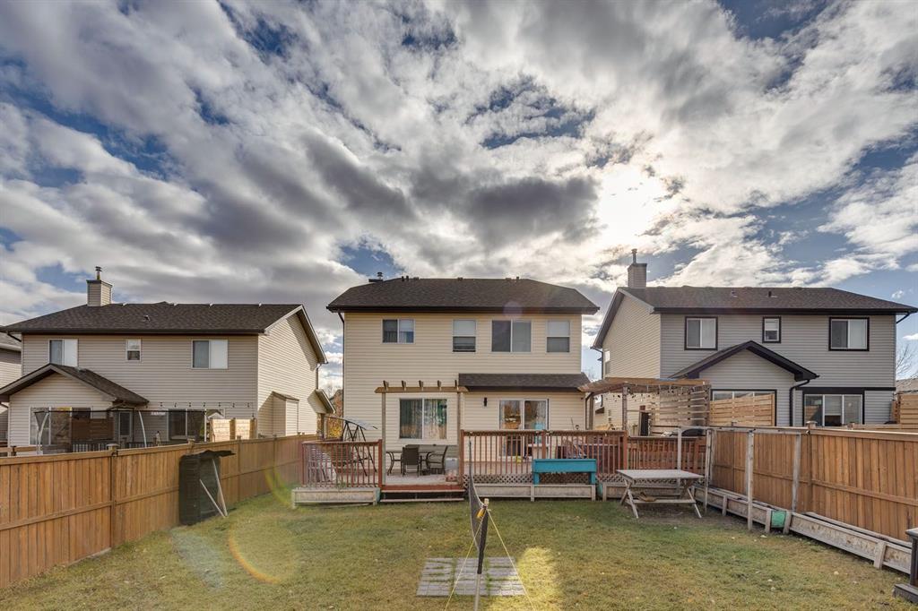 Great opportunity to own this fully finished 4-bedroom, 3.5-bath home offering over 3,000 SqFt of comfortable living space. The main floor welcomes you with its spacious open layout and easy-care laminate flooring throughout. The inviting living room features a cozy gas fireplace, creating the perfect spot to unwind. The large kitchen offers plenty of workspace, a generous island, and an expansive dining area that opens to a deck and fenced yard—ideal for gatherings and outdoor enjoyment. Upstairs, you'll find a bright vaulted bonus room and two additional bedrooms. The primary suite, tucked at the back of the home, features a walk-in closet and a 4-piece ensuite. The fully finished basement adds even more versatility with a fourth bedroom, den, and an additional 3-piece bath. Perfectly located across from the school and close to shopping, parks, and everyday conveniences—this is a home your family can grow into and love for years to come.